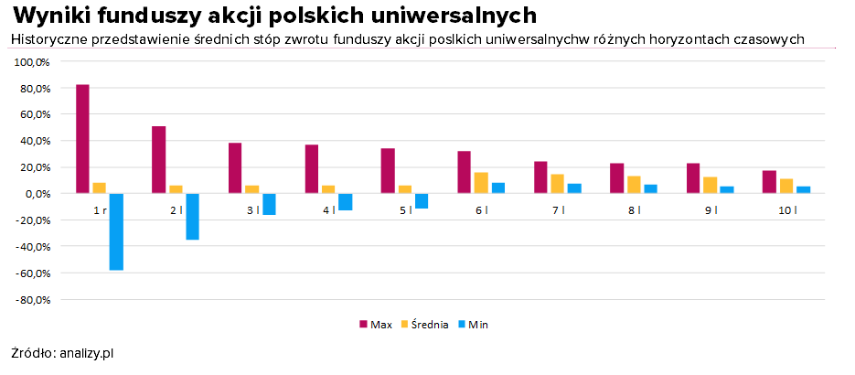 W przypadku funduszy akcji polskich uniwersalnych roczne stopy zwrotu wahały się między maksymalną 82,6% a minimalną -58,3%, czyli rozpiętość sięgnęła aż 140,9 pkt proc. Im dłuższy horyzont inwestycyjny, tym wartości maksymalne i minimalne sukcesywnie zbliżają się do średniej, a w 6-letnim minimalna stopa zwrotu przestaje mieć wartości ujemne.