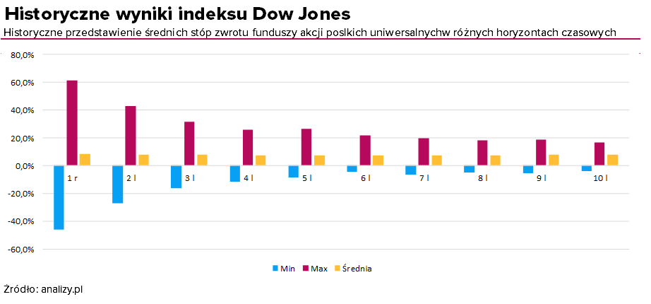 Im krótszy horyzont inwestycyjny, tym różnice między najgorszą inwestycją a najlepszą są największe. Weźmy za przykład historyczne stopy zwrotu z indeksu Dow Jones w okresie od grudnia 1969 roku. W przypadku rocznej stopy zwrotu amerykańskiego indeksu akcji rozstrzał wyników pomiędzy najlepszą (61,4%) i najgorszą (-46,1%) roczną stopą zwrotu sięgał aż 107,5 pkt proc., podczas gdy średni wynik wynosił 8,6%. Wraz z wydłużaniem się horyzontu inwestycyjnego rozstrzał ten był coraz mniejszy - a w przypadku 10-letniej stopy zwrotu sięga już 20,9 pkt proc. dla najlepszej stopy rzędu 16,8% i najgorszej na poziomie -4,1%. Średni wynik wynosi w tym przypadku 7,8%.