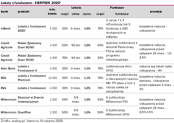 W mBanku w pakiecie „Lokata z funduszem 2020” dostępna jest lokata 6-miesięczna. Minimalna kwota to 5 tys. zł, z których 30% trafia na część depozytową, a pozostałe 70% do wybranych funduszy. Klienci mogą wybrać 1 z 3 mFunduszy lub samodzielnie zbudować portfel z 5 funduszy wybranych z oferty ok. 200 produktów. Co istotne, przez pól roku trwania lokaty nie można zmieniać funduszy, gdyż traci się wtedy promocyjne oprocentowanie.