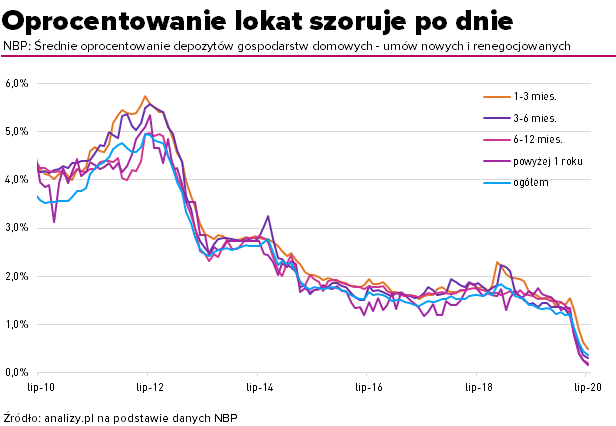 Najwyżej oprocentowane pozostały depozyty krótkoterminowe o terminie zapadalności 1-3 mies., zawyżane przez różne oferty promocyjne – przeciętna stawka spadła z 0,63% w czerwcu do 0,50% w lipcu. Najniżej oprocentowane są lokaty zakładane na dłuższy termin, powyżej 1 roku – w ich przypadku średnia stawka obniżyła się z 0,27% do zaledwie 0,15%. To efekt trzech obniżek stóp procentowych dokonanych przez Radę Polityki Pieniężnej. Ostatnia miała miejsce pod koniec maja – do 0,1%.