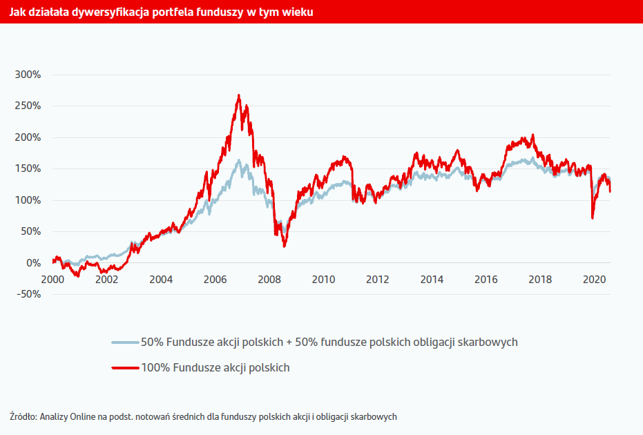 Inwestowanie, również w fundusze, wiąże się z ryzykiem, ale można je utrzymać w ryzach, stosując odpowiednią długość horyzontu inwestycyjnego, podstawowe zasady dywersyfikacji czy regularne wpłaty. Poniżej przedstawiamy wyniki dwóch prostych portfeli z okresu październik 2000 – październik 2020. Pierwszy (czerwona linia) jest złożony w 100% z funduszy akcji polskich (średnia dla grupy). Drugi – w połowie z funduszy akcji polskich, a w połowie z funduszy obligacji skarbowych. W ostatnich 20 latach średni fundusz akcji polskich dał zarobić ok. 113%. Natomiast portfel złożony w połowie z takiego funduszu i połowie z funduszu polskich obligacji skarbowych wypracował wyższy wynik 128%. Średnioroczna stopa zwrotu to zatem kolejno 3,9% i 4,2%. Nawet najprostszy podział pomiędzy dwa średnie fundusze polskich akcji i obligacji skarbowych sprawił, że ryzyko wejścia na „górce” i perspektywa długiego odrabiania strat została mocno ograniczona.Portfel podzielony pomiędzy fundusze akcji i obligacji nie tylko był znacznie mniej zmienny, ale również dał zarobić w długim terminie więcej od strategii agresywnej. Może się to wydawać zaskakujące, ale wynika po pierwsze ze słabości polskiej giełdy, a po drugie z wieloletniej hossy na rynku długu. Choć tak dobry okres dla rynku długu może się już nie powtórzyć w kolejnej dekadzie, niewykluczone, że następne lata będą za to lepsze dla polskiego rynku akcji. Na tym właśnie polega idea dywersyfikacji. Fundusze bardzo dobrze się do tego nadają, ale tylko niewielka część badanych (7%) wskazuje, że to mogłoby ich do nich zachęcić.
