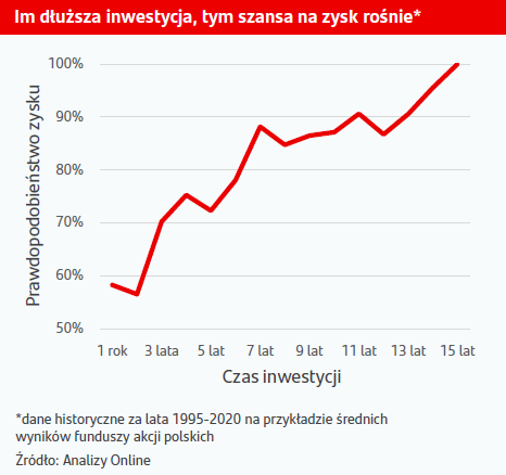 Rynki i gospodarki są cykliczne i istnieje ryzyko wejścia na „górce” u szczytu hossy. Dlatego innym sposobem na ograniczenie ryzyka inwestycyjnego jest odpowiedni horyzont inwestycyjny. Trzymając się przykładu funduszy akcji polskich – im dłużej trwała inwestycja, tym większa była szansa na wypracowanie zysku. W pierwszym roku szansa na wypracowanie zysku wynosiła 58% i istotnie rosła wraz z czasem.Polki i Polacy deklarują, że oszczędzają na przyszłość (35% wskazań badanych), na dzieci (24%) czy na emeryturę (12%). To może oznaczać, że wybierają dłuższy horyzont inwestycyjny, ale niepokojące jest to, że aż 62% oszczędzających go nie definiuje.
