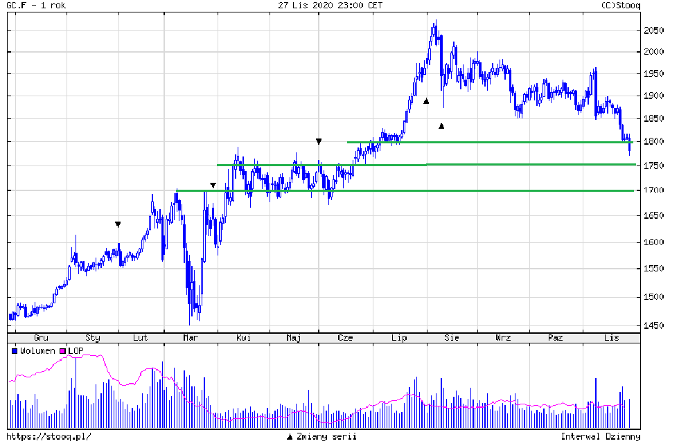 Po sierpniowym szczycie rozpoczęliśmy korektę, która przez półtora miesiąca przyjmowała formację trójkąta, a następnie po wybiciu w dół i spadku do poziomu 1850, kolejne dwa miesiące do połowy listopada była to nieregularna konsolidacja powyżej poziomu 1850 dolarów. Ten poziom był istotnym wsparciem i jego pokonanie przerodziło się w mini panikę, z którą mamy obecnie do czynienia. Na wykresie zielonymi liniami oznaczyłem istotne poziomy, które w obecnym układzie rynku powinny mieć znaczenie. Pierwszy taki poziom to 1800 dolarów, który ma historyczne znaczenie, ale obecnie był tylko potwierdzony przez lipcową konsolidację. Jego siła, jako wsparcia, nie była zbyt duża i łatwo został pokonany. Znacznie większe znaczenie ma strefa pomiędzy 1700 i 1750 dolarów. Dwa miesiące konsolidacji od połowy kwietnia do połowy czerwca, wskazują, że przy tych poziomach wielu inwestorów kupiło lub sprzedało kontrakty na złoto, co zwiększa szanse, że przy tych poziomach pojawi się silniejszy popyt.