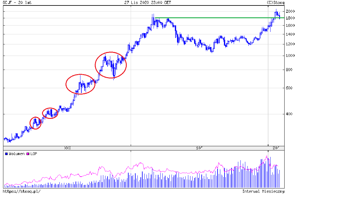 Kiedy jednak mówimy o inwestowaniu z wykorzystaniem długoterminowych trendów, to powinniśmy patrzeć na naszą inwestycję poprzez taką perspektywę. Warto więc spojrzeć jak obecna korekta wygląda z perspektywy zmian cen na rynku złota przez ostatnie 20 lat.