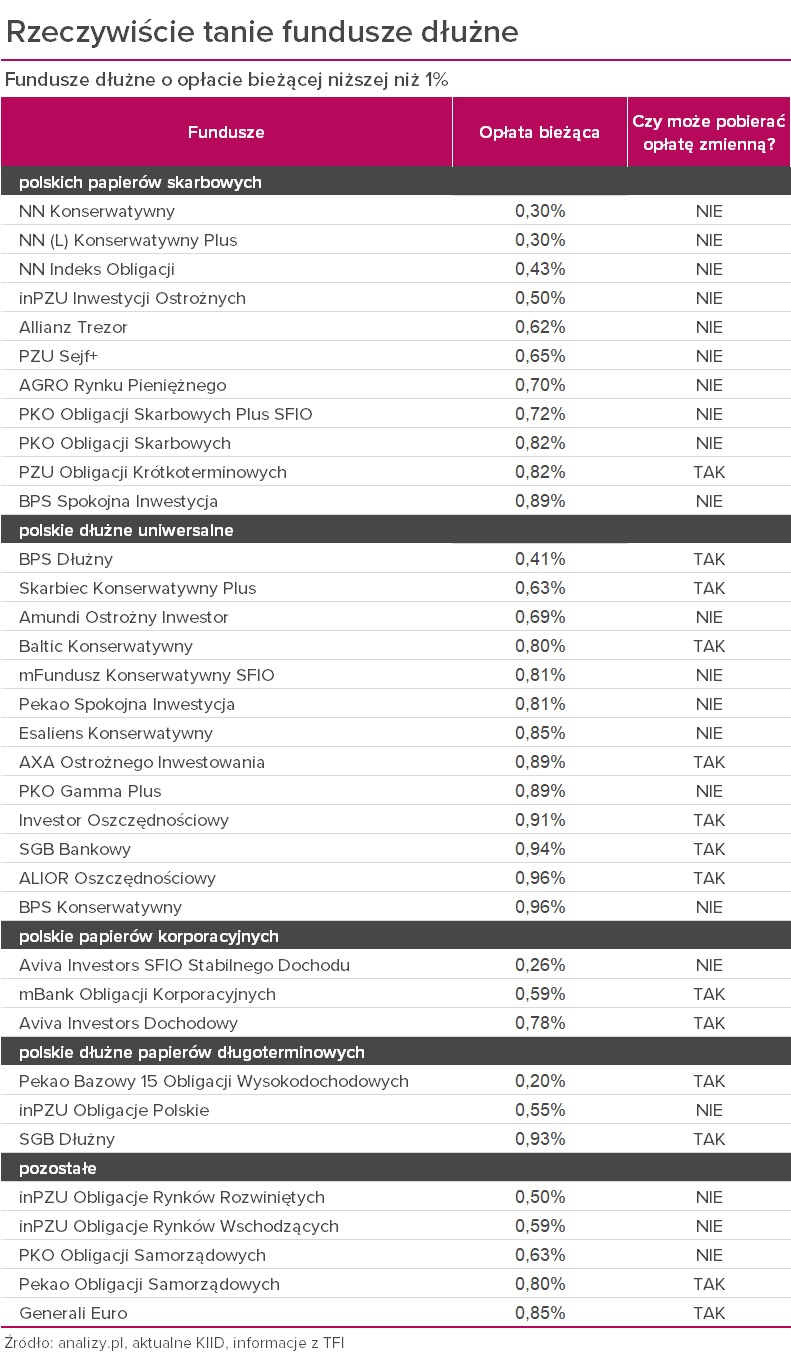 Tak czy inaczej miejsca do wypracowywania dodatkowej stopy zwrotu na polskim rynku długu jest niewiele. Z perspektywy klienta najprostszym rozwiązaniem może być szukanie funduszy o najniższych kosztach. Tych, których na starcie mają przewagę nad droższą konkurencją. Sprawdziliśmy więc, jak wygląda oferta TFI pod tym względem. Poniżej znajduje się lista funduszy dłużnych z opłatą bieżącą poniżej 1%. Opłata bieżąca uwzględnia opłatę za zarządzanie i koszty administracyjne funduszu (takie jak depozytariusz czy agent transferowy). Dane pochodzą z dokumentów KIID i są liczone są za rok poprzedni lub są to szacunki, jeśli mamy do czynienia z nowym funduszem. W przypadku niektórych z zestawienia tegoroczne opłaty bieżące mogą okazać się niższe lub wyższe – dowiemy się w przyszłym roku wraz z publikacją nowych KIID-ów.Najwięcej funduszy o bieżących opłatach niższych od 1% znajdziemy w grupach funduszy polskich papierów skarbowych i dłużnych uniwersalnych – to tam wylądowała większość z dawnej grupy gotówkowych i pieniężnych. Część funduszy pobiera jednak dodatkowo jeszcze zmienną opłatę za zarządzanie, która nie jest ujęta w opłatach bieżących.