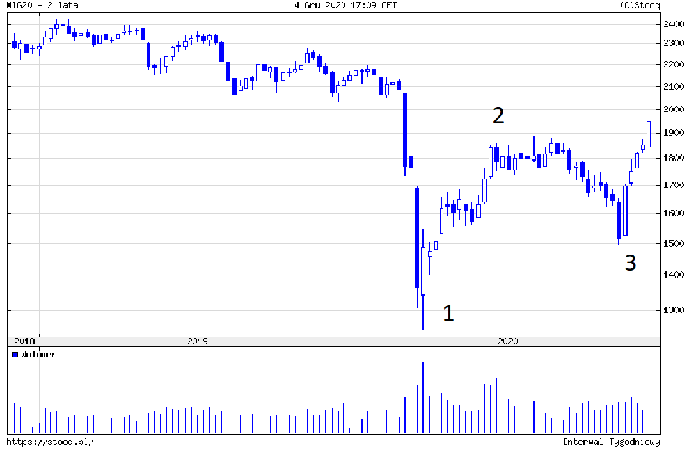 W marcu rynki akcji uległy panice, która przekroczyła wszystko czego inwestorzy doświadczyli od 1987 roku, a nawet od lat 30-tych ubiegłego stulecia. Nie chodzi o głębokość spadków, ale ich szybkość. W ciągu trzech, czterech tygodni rynki akcji straciły ponad 30%. Główną przyczyną spadków były obawy przed skutkami lockdownów, czyli zamknięcia gospodarek. Z jednej strony zamknięcie przedsiębiorstw ograniczało produkcję, z drugiej strony ograniczenie przychodów gospodarstw domowych wpływało na konsumpcję. Rynki akcji odreagowały spadki dzięki temu, że banki centralne i rządy podjęły bezprecedensowe działania mające na celu obniżenie kosztu kredytów, zwiększenie płynności na rynkach finansowych, uchronienie firm przed bankructwami i ograniczenie wzrostu bezrobocia. Osłabienie fali epidemii i powrót gospodarek do wzrostu aktywności poprawiły nastroje na rynkach i  napędziły wzrosty, które wyhamowały dopiero latem. Jesień przyniosła kolejną falę epidemii i w październiku na rynkach akcji pojawiła się panika, zwłaszcza w sektorach najmocniej podatnych na negatywne skutki lockdownów. Do wzrostów powróciliśmy w listopadzie i na większości rynków trwają one do dziś. Jeżeli spojrzymy na wykres WIG20, to możemy prześledzić zarówno zmiany cen, jak również przypisać im odpowiednie zmiany nastawienia inwestorów.Co dalej z polskim rynkiem akcji?Pierwsza fala spadków (1) skończyła się w marcu, gdy większość inwestorów była przerażona i nie spodziewała się, by rynki akcji były w stanie szybko powrócić do normalności. Fala wzrostów (2) skończyła się wówczas, gdy okazało się, że gospodarka podnosi się z zapaści z II kwartału i również wzrósł optymizm na rynkach akcji. Kolejna fala, tym razem spadkowa (3), skończyła się, gdy większość inwestorów zaczęła obawiać się, że ponowne zamknięcie gospodarki spowoduje znaczne pogorszenie koniunktury, a więc również wyników spółek.