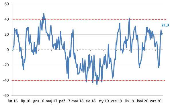 Zmiany nastrojów na warszawskiej giełdzie dobrze prezentuje zmiana nastawienia inwestorów indywidualnych, które publikuje  Stowarzyszenie Inwestorów Indywidualnych.Co dalej z polskim rynkiem akcji?Indeks Nastrojów Inwestorów pokazuje różnicę pomiędzy udziałem byków i niedźwiedzi (nastawieniem optymistycznym i pesymistycznym do polskiego rynku akcji). Jak widać w okresie marcowej paniki indeks przyjął wartość poniżej -20 punktów, podobnie jak w październiku. Dla odmiany latem i obecnie ten poziom utrzymuje się powyżej +20 punktów. I chociaż ten indeks nie zawsze wyznacza punkty zwrotne dla rynku, to dość często stanowi sygnał ostrzegawczy. Przy szybkich zmianach nastrojów pojawienie się pozytywnych odczytów sugeruje przynajmniej tymczasowe przesilenie i spadkową korektę. Natomiast szybki wzrost pesymizmu sugeruje, że spadki mogą wyczerpywać swój potencjał.