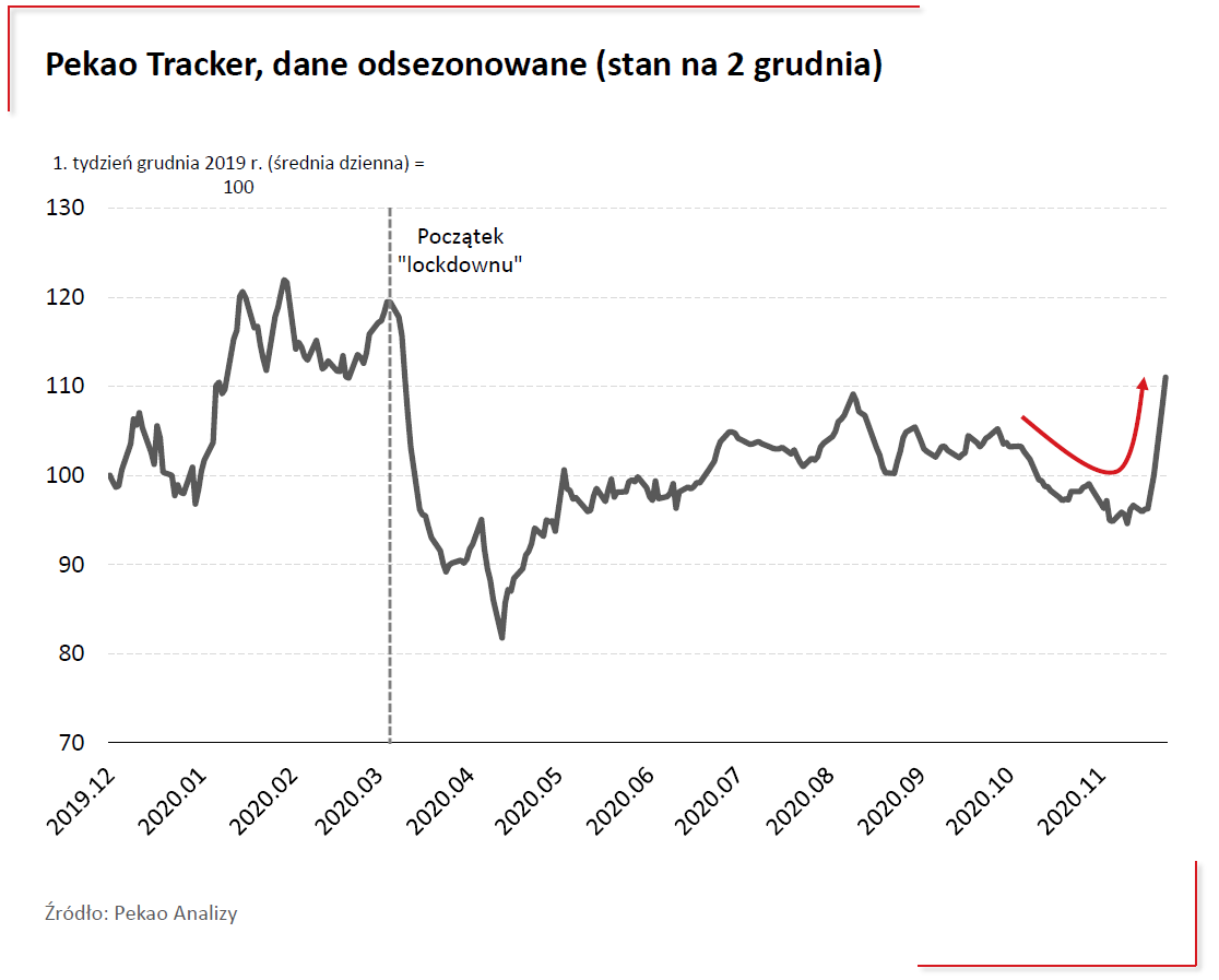 Dla odmiany, gdy prześledzimy Pekao Tracker, czyli indeks koniunktury w gospodarce, który został stworzony przez ekonomistów z Banku Pekao, a który wykorzystuje dane bankowe i rynkowe o wysokiej częstotliwości do monitorowania sytuacji w gospodarce, to widać że zmiany indeksu WIG20 odzwierciedlają kierunek zmian w gospodarce.Co dalej z polskim rynkiem akcji?Marcowe załamanie indeksu WIG20 miało swoje potwierdzenie w załamaniu aktywności gospodarczej, późniejsza poprawa nastrojów na giełdzie to wzrost tej aktywności. Ostatnie miesiące to najpierw spadek aktywności, a obecnie bardzo szybki jej wzrost. To dobrze rokuje dla przyszłej koniunktury na GPW, ale warto pamiętać o zagrożeniach.