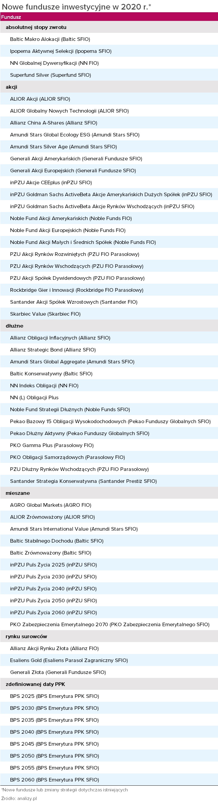 Lista nowych funduszy inwestycyjnych w 2020 r. (w tym również funduszy, które zmieniły strategię) wygląda następująco:Duże roszady zaszły w ofercie Noble Funds TFI – ich pięć funduszy zmieniło nazwy i strategie. Na przykład, towarzystwo postanowiło zmienić dwa fundusze absolutnej stopy zwrotu – Noble Fund Timingowy i Noble Fund Global Return w Noble Fund Akcji Europejskich i Noble Fund Akcji Amerykańskich. TFI tłumaczyło to chęcią lepszego powiązania wyników funduszy z indeksami i w związku z tym lepszego zrozumienia przez klientów i sprzedawców tych produktów. Na podobny ruch zdecydowało się Generali Investments TFI, które zmieniając strategie wprowadziło do oferty Generali Akcji Amerykańskich i Generali Akcji Europejskich.