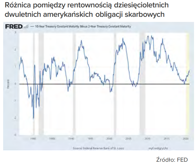 Za pozytywnym rozwojem sytuacji gospodarczej i na rynkach akcji przemawia między innymi wskaźnik, który historycznie dawał bardzo wiarygodne wskazania na temat rozwoju koniunktury gospodarczej. Różnica pomiędzy rentownością dziesięcioletnich i dwuletnich amerykańskich obligacji skarbowych, kiedy spada poniżej zera zapowiada kłopoty w gospodarce. Ujemna różnica w rentownościach sugeruje, że poziom stóp procentowych jest nie do utrzymania i prawdopodobne są obniżki stóp procentowych przez Fed, co będzie konsekwencją pogorszenia się koniunktury gospodarczej.