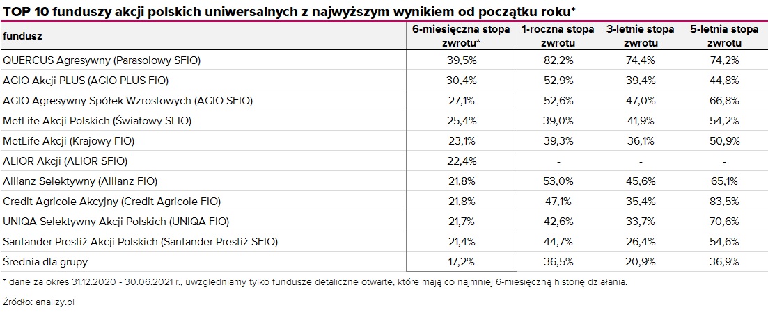 W rezultacie rozwiązania z ekspozycją na polski parkiet dostarczyły inwestorom najwięcej powodów do zadowolenia. I choć to fundusze akcji małych i średnich spółek dzierżyły palmę pierwszeństwa, postanowiliśmy tym razem skoncentrować się na funduszach akcji polskich uniwersalnych. W analizowanym (półrocznym) okresie zyskały one średnio +17,2%. Mając na uwadze znakomitą passę małych spółek, nie dziwi fakt, że na prowadzenie w zestawieniu wysunęły się m.in. produkty z relatywnie wysoką ekspozycją na spółki o małej kapitalizacji. Dobrze wypadły również produkty, które miały wówczas w portfelach m.in. spółki z sektora motoryzacyjnego, odzieżowego czy banki – to właśnie te indeksy zachowywały się w pierwszej połowie najlepiej.
