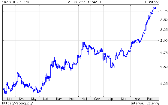 RPP ignorowała decyzje innych banków centralnych z regionu, które podnosiły stopy procentowe, jak również sygnały, że inflacja może być zjawiskiem znacznie trwalszym. Dopiero na ostatnim posiedzeniu, w październiku, Rada zdecydowała się na podwyżkę stopy referencyjnej o 40 punktów bazowych. Ponieważ podwyżka ta została przeprowadzona bez wcześniejszego przygotowania rynku, co więcej wypowiedzi prezesa Glapińskiego tuż przed posiedzeniem Rady wskazywały, że takiego ruchu nie będzie, to rynki odebrały ten ruch, jako przejaw paniki Rady. Zresztą wypowiedź Łukasza Hardta, członka RPP, że podwyżka była konsekwencją błędów popełnionych wcześniej, potwierdziła taką interpretację. W konsekwencji rentowności obligacji skarbowych rosły przez cały październik, a rentowności obligacji 10-letnich przekroczyły poziom 2,8%.