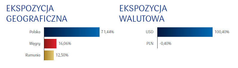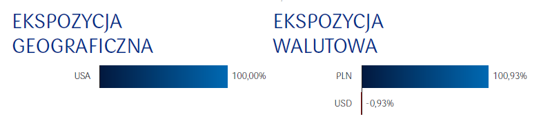 W przypadku PKO Akcji Rynku Amerykańskiego informację o zabezpieczeniu walutowym portfela możemy również znaleźć w karcie funduszu. Tu jednak informacja jest podana wprost w ujęciu graficznym. Ekspozycja geograficzna – USA 100%, a ekspozycja walutowa – PLN 100,93%. Co oznacza, że cały portfel jest zabezpieczony.