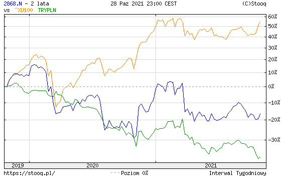 To nie oznacza, że fundusz Investor Turcja był źle zarządzany. Po prostu wycena jednostki funduszy jest wyceniana w złotym, a XU 100 w lirze. W tym czasie lira do złotego (zielona linia) straciła prawie 40% i to jest główna przyczyna strat, które zanotował fundusz.