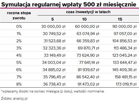 Mając na uwadze powyższe argumenty, które przemawiają za systematycznym odkładaniem środków, warto rozważyć prostą stymulację. Odzwierciedla ona, ile możemy zyskać, odkładając 500 zł miesięcznie w zależności od stopy zwrotu i horyzontu inwestycyjnego.