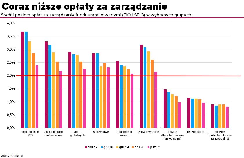 Poziom opłat w funduszach inwestycyjnych przez lata był bardzo wysoki. Dopiero wejście w życie wspomnianego rozporządzenia istotnie coś zmieniło. W ostatnich trzech latach koszty wyraźnie spadły, choć głównie tam, gdzie musiały, czyli przede wszystkim w funduszach droższych - z segmentu akcyjnego i mieszanego. Jeszcze kilka lat temu nierzadko pobierały one nawet ponad 4%. Od 2018 roku średni poziom opłat w przypadku funduszy akcji polskich oraz zrównoważonych został obniżony o ponad 30%, a dokładniej np. w funduszach akcji polskich uniwersalnych z średnio 3,2% do średnio 2,2%, a zrównoważonych z 3,1% do 2,1% obecnie.