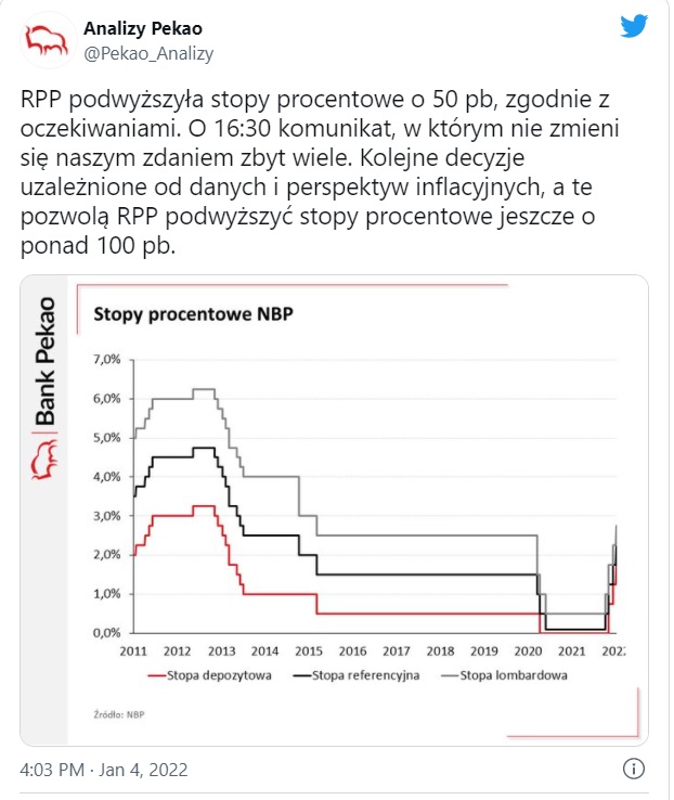 Ekonomiści PKO BP przewidują, że stopa referencyjna dotrze w 2022 r. do poziomu 3,5 proc. - Kolejnej podwyżki oczekujemy już w lutym, chociaż będzie to posiedzenie nietypowe, bez nowych danych inflacyjnych – zastrzegają ekonomiści PKO BP.