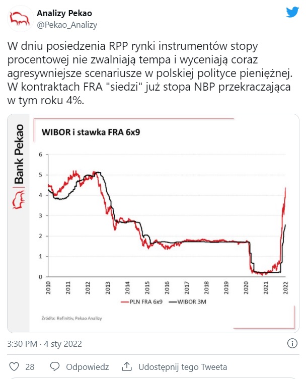 Eksperci mBanku stopę docelową w 2022 r. widzą w okolicach 4 proc. Ich zdaniem jednak, piętrzące się ryzyka dla wzrostu PKB oznaczają, że RPP będzie próbowała rozłożyć te podwyżki w czasie. - Można nastawić się na cały rok zacieśnienia polityki pieniężnej, choć główne uderzenie wykonane zostanie najprawdopodobniej w pierwszej połowie roku. Nie wykluczamy przy tym, że stopy w 2023 roku mogą być już redukowane (ryzyko większego spowolnienia na horyzoncie, zbliżający się koniec cyklu) – argumentują ekonomiści mBanku.