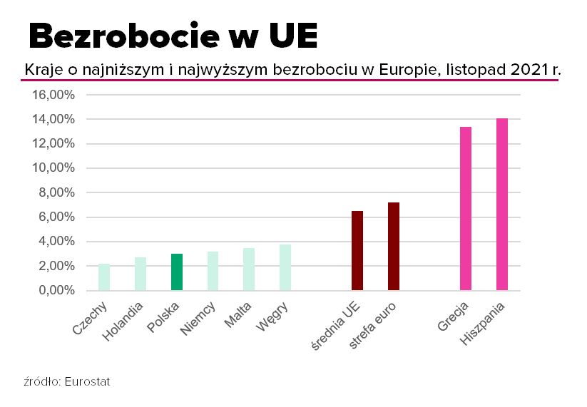 Zgodnie z danymi opublikowanymi przez Eurostat stopa bezrobocia w listopadzie 2021 roku wyniosła w Polsce 3,0% i była jedną z najniższych wśród 28 uwzględnionych w zestawieniu krajów. To odczyt identyczny z tymi z września i października. Lepszymi wskaźnikami mogą się pochwalić jedynie dwa kraje: Czechy i Holandia. "Rekordziści" natomiast, Grecja i Hiszpania, mają odczyty dwucyfrowe.
