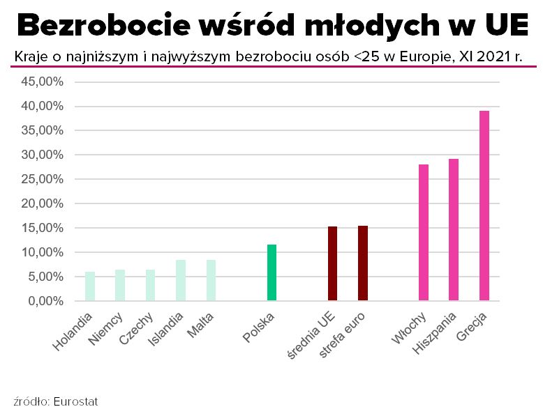 Na tym polu Polska nie wygląda już tak dobrze jak w zestaweniu stóp bezrobocia ogółem. Wśród 23 krajów, z których udało się pozyskać dane, znajdujemy się na dziewiątym miejscu z wynikiem 11,6%. To wciąż lepiej od średniej, ale tę zawyżają znów kraje południa Europy: Grecja (39,1%), Hiszpania (29,2%) oraz Włochy (28,0%).