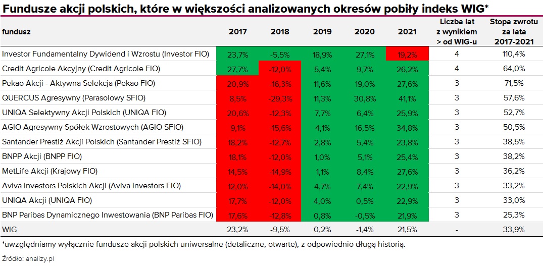 Jak wynika z powyższej tabeli, to zadanie najczęściej realizowały dwa fundusze – Investor Fundamentalny Dywidend i Wzrostu (dawniej Investor Akcji Spółek Dywidendowych) oraz Credit Agricole Akcyjny. W czterech na pięć analizowanych okresów pobiły one indeks szerokiego rynku. Strategie tych produktów są jednak zróżnicowane. Pierwszy z wymienionych to nietypowy reprezentant grupy. Zarządzający nim chętnie dołącza do portfela walory zagraniczne, a ich udział historycznie sięgał nawet do 40% aktywów netto, co m.in. w 2020 r. umożliwiło mu partycypację w silnych wzrostach amerykańskich spółek technologicznych. Oznacza to, że właśnie w okresach relatywnej słabości polskiej giełdy może stanowić przewagę konkurencyjną funduszu. Rozwiązanie to nie przypadnie jednak do gustu inwestorom, poszukującym częstej ekspozycji na polski pakiet. Z kolei Credit Agricole Akcyjny ma nieco bardziej klasyczną konstrukcję. W jego portfelu znajdziemy głównie akcje polskie, komponent zagraniczny historyczne sięgał do kilkunastu procent aktywów netto. Warto dodać, że stopy zwrotu z tych produktów w ujęciu 5 lat zdecydowanie przewyższają indeks WIG – pierwszy z nich ponad 3-krotnie, a drugi niemal 2-krotnie.
