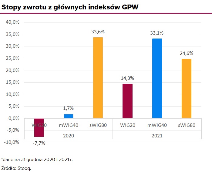 Pozytywny sentyment inwestycyjny obserwowaliśmy również na warszawskim parkiecie, który znacząco wyróżnił się na tle zagranicznych giełd. Dość wspomnieć, że indeks szerokiego rynku (WIG) pokonał rekord wszech czasów, pokonując poziomy obserwowane po raz ostatni w 2007 r. Chociaż w miesiącach jesiennych nastroje pogorszyły się, to w ujęciu roku WIG zyskał solidne + 21,5%. Wszystkie główne indeksy GPW wypracowały wówczas dwucyfrowe stopy zwrotu, przy czym prym wiodły spółki małe (sWIG80), jak i średnie (mWIG40). Zyskały odpowiednio + 24,6% i +33,1%.
