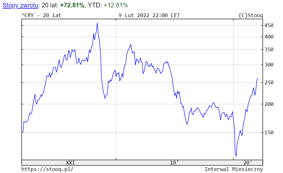 W 2020 r., czyli w czasie największego nasilenia negatywnych skutków pandemii, światowy indeks akcji MSCI World Index zyskał ponad 13 proc. Rok wcześniej rósł o 26 proc. a w ubiegłym roku szedł w górę o ponad 20 proc. Podobnie zachowywały się indeksy giełdowe państw najbardziej rozwiniętych. W 2019 r., a więc w okresie dobrej koniunktury, surowcowy CRB Index zwyżkował jedynie o nieco ponad 9 proc., w pandemicznym następnym roku poszedł w dół o niemal 10 proc. i dopiero w 2021 r. zaczął odrabiać straty i dystans do indeksów giełdowych, rosnąc o ponad 38 proc. Bardzo dobra passa rynków surowcowych trwa do dziś, a indeks znajduje się najwyżej od listopada 2014 r. Ostatnie dwanaście miesięcy przynosi wzrost CRB Index o ponad 40 proc., a zwyżka d początku obecnego roku sięga prawie 12 proc., podczas gdy większość rynków akcji przynosi inwestorom straty.