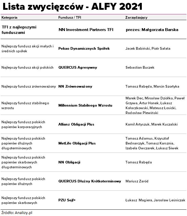 W ramach Alf 2021 przyznaliśmy 9 nagród dla najlepszych funduszy oraz 18 wyróżnień, a także 1 nagrodę dla TFI z najlepszymi funduszami i dwa wyróżnienia.