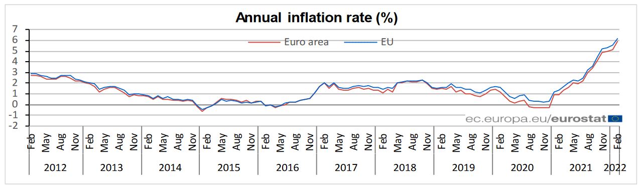 Roczna inflacja wzrosła w lutym w strefie euro do 5,9%, a w całej Unii Europejskiej o 6,2%. To historyczne szczyty (dla konsumentów euro jako wspólna waluta większości państw Unii istnieje od 2002 roku).