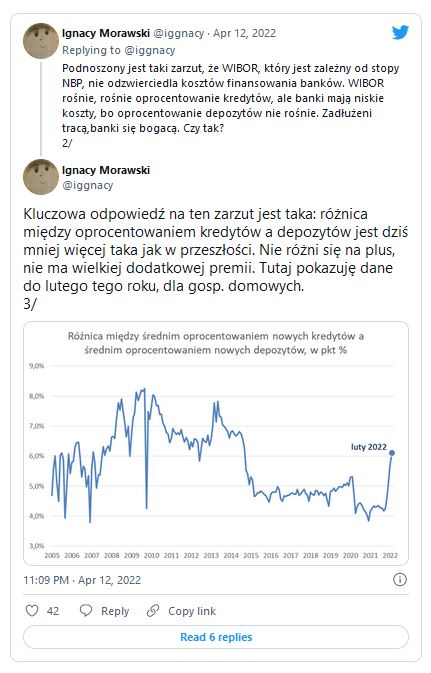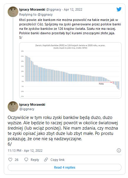 Padają również zarzuty (chociażby w komentarzach pod odcinkiem Analiz LIVE z 12 kwietnia pt. "Wiborowa pętla"), że w "normalnych" europejskich krajach oprocentowanie kredytów hipotecznych wynosi 2%, do tego raty są stałe przez cały okres kredytowania. Tyle tylko, że w strefie euro stopy procentowe, mimo historycznie wysokiej inflacji, są wciąż na zerowym poziomie. A jak widać z przytaczanego przez Ignacego Morawskiego, głównego ekonomistę Pulsu Biznesu na podstawie danych MFW zestawienia, banki w Polsce wcale nie zarabiają kokosów.