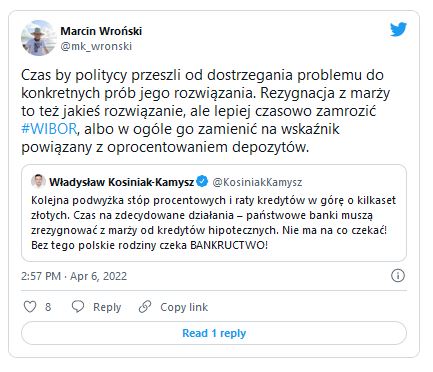– Polski system bankowy powinien zostać przeanalizowany pod kątem tego, jak banki finansują kredyty i czy uzyskiwane przez nie różnice marżowe nie są zbyt duże. Temu procesowi powinny się przyjrzeć KNF i UOKiK – powiedział. – Wszelkie działania związane z zamrożeniem WIBOR-u byłyby niebezpieczne z punktu widzenia zasad działania sektora bankowego. Takie rozwiązanie byłoby korzystne dla kredytobiorców, jeśli zostałoby wprowadzone na krótki okres obowiązywania wysokich stóp procentowych, ale trzeba pamiętać, że kredytu nie można oceniać wyłącznie tylko pod kątem bieżących kosztów jego obsługi.