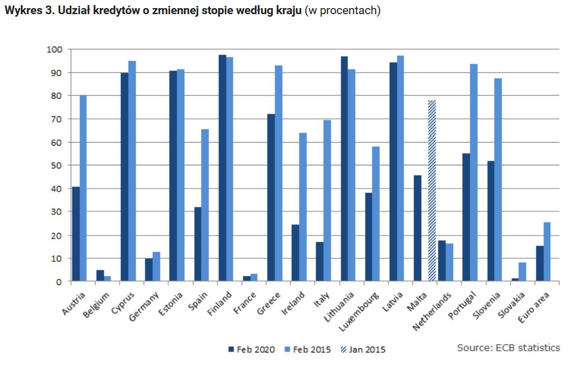 Warto też pamiętać, że wcale nie we wszystkich krajach UE i strefy euro dominują kredyty o stałym oprocentowaniu. Owszem, tak jest np. we Francji, Belgii, Słowacji czy Niemczech (obecność Francji i Niemiec sprawia, że udział kredytów zmiennych dla strefy euro jako całości jest dosyć niski, wynosi kilkanaście procent). Jednak w krajach bałtyckich, na Cyprze, czy w Finandii wciąż przeważają kredyty o zmiennym oprocentowaniu. Nieznacznie więcej niż tych o stałej stopie jest też w Portugalii i Słowenii, choć ich udział w ostatnich latach wyraźnie spadł.