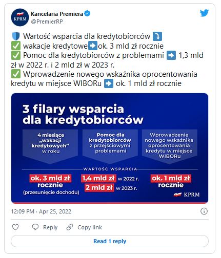 Łącznie w 2022 i w wyborczym 2023 roku ma to kosztować (zgodnie z poniższym oficjalnym tweetem) 10,3 miliarda złotych. Można powiedzieć, że nie są to wielkie pieniądze jak na skalę budżetu państwa (ustawa budżetowa na br. zakłada 491,9 mld zł dochodów, 521,8 mld zł wydatków) i dotychczas wprowadzone przez rząd programy socjalne, które kwartał temu Business Insider Polska szacował na 240 mld złotych.