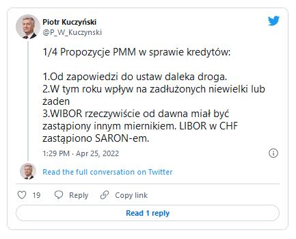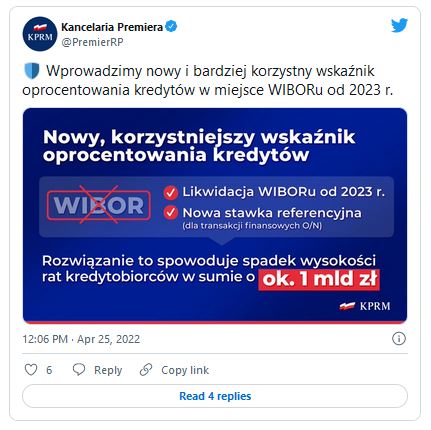 Dodał także, że zamiana ma dotyczyć tylko kredytów hipotecznych, a "WIBOR będzie nadal używany przy kredytach dla firm i konsumenckich". Wciąż jednak pozostało pytanie, co z produktami opartymi na WIBOR-ze, a niebędącymi kredytami. To m.in. część lokat i kont oszczędnościowych. Wydaje się więc, że trzeba poczekać na więcej konkretów ze strony rządu i bardziej szczegółowych, bazujących na tych konkretach, analiz.