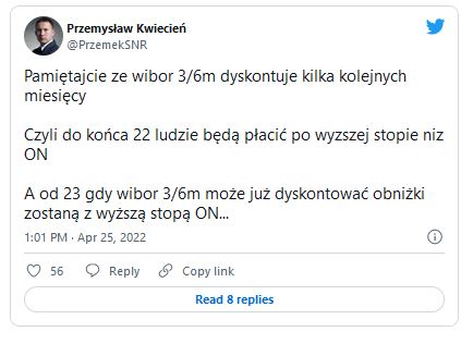 Najważniejsza ma być jednak likwidacja WIBOR-u jako "winowajcy" rosnących rat. Przypomnijmy, że kredyty hipoteczne zazwyczaj oparte są na stawkach 3M i 6M, wyższych niż WIBOR-y jednodniowe. Zastąpić go ma właśnie odpowiednik WIBOR-u ON (overnight). 20 kwietnia wynosiły one odpowiednio 5,65% i 5,88%, podczas gdy ON 4,40%.