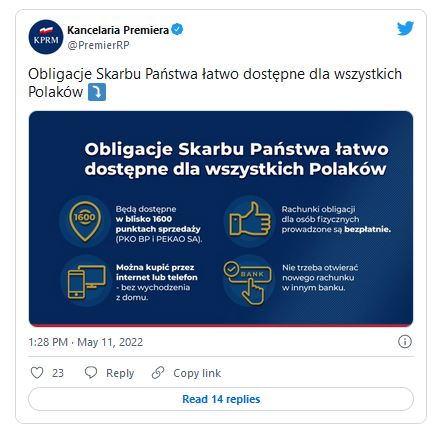 Mają to być obligacje jednoroczne oparte o aktualnie obowiązującą stopę referencyjną NBP oraz obligacje dwuletnie, oferujące pewną marżę powyżej tej stopy. Papiery jednoroczne mają być benchmarkiem dla lokat bankowych. Szczegóły propozycji poznamy po 20 maja, a obligacje mają być dostępne już w czerwcu. I to łatwo dostępne.