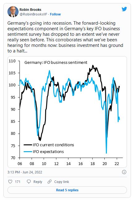 – Zarówno bieżąca ocena, jak i komponent oczekiwań osłabiły się w czerwcu, a oczekiwania prawie wróciły do poziomów z marca. Przyczyny stłumionego optymizmu są jasne: wojna na Ukrainie, blokady w Chinach i wynikające z niej tarcia w łańcuchu dostaw, wyższe koszty i ceny oraz słabnący popyt. Właściwie to nie pierwszy raz, kiedy nastroje w niemieckim biznesie wydają się opóźniać reakcję na wydarzenia globalne. Stagflacja pozostaje naszym podstawowym scenariuszem dla niemieckiej gospodarki, a całkowita recesja jest naszym scenariuszem ryzyka – komentuje Carsten Brzeski, główny ekonomista ING Niemcy.