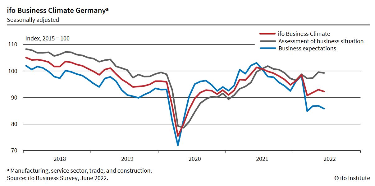 Tuż przed weekendem poznaliśmy odczyt indeksu Ifo, mierzącego klimat biznesowy w Niemczech. W czerwcu spadł on do 92,3 pkt w porównaniu z 93,0 pkt w maju. Przedsiębiorcy oceniają gorzej niż przed miesiącem zarówno obecną sytuację swoich firm, jak i perspektywy na przyszłość. – Rosnące ceny energii i groźba niedoborów gazu spędzają sen z powiek niemieckiemu biznesowi – mówi prezes Instytutu Ifo Clemens Fuest.