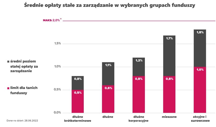 Wypracowaliśmy własną metodologię, szczegółowo opisaną w sekcji "Fundusze z niskimi opłatami". Według niej "tanie fundusze" to takie, które nie pobierają opłaty zmiennej za sukces, pobierają stałą opłatę za zarządzanie równą lub niższą od ustalonego poziomu (np. akcyjne – maksymalnie 1,0%), a poziom opłat bieżących (publikowany w KIID-ach) jest nie wyższy niż o 0,2 pkt proc. limitu dla stałej opłaty za zarządzanie (np. w przypadku funduszy akcyjnych – maksymalnie 1,2%).