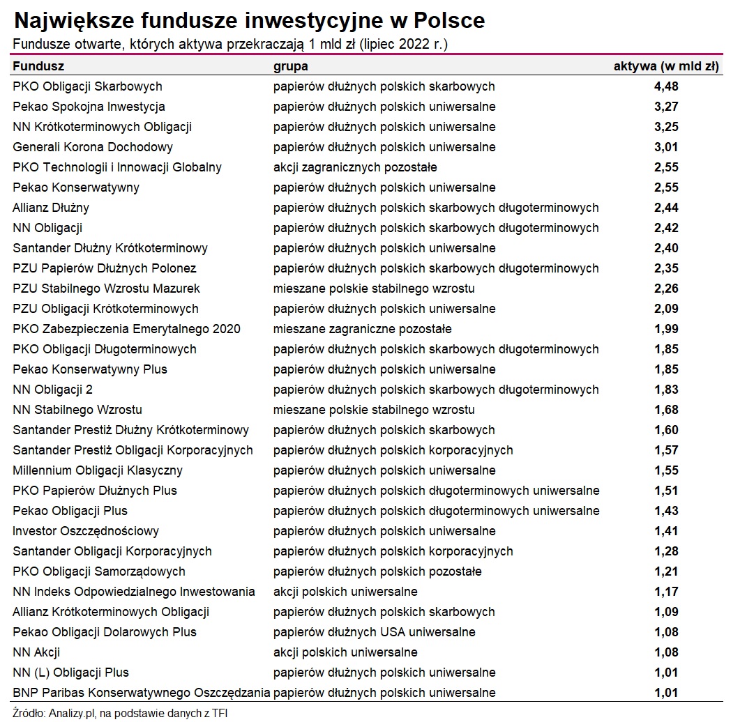 Największym funduszem inwestycyjnym w Polsce już od wielu lat pozostaje PKO Obligacji Skarbowych, którego aktywa na koniec lipca tego roku sięgały niemal 4,5 mld zł. To o 0,6 mld zł więcej niż - przykładowo - wynosiły w tym czasie łączne aktywa zgromadzone we wszystkich funduszach Millennium TFI, uznawanego za średniej wielkości krajowego powiernika.