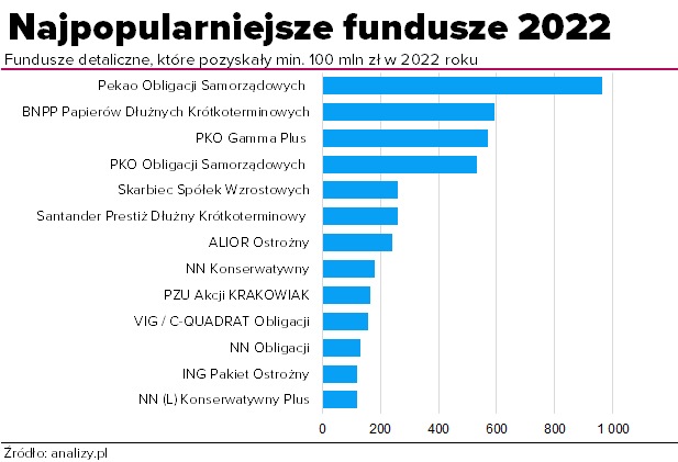Dla stałych obserwatorów rynku funduszy i naszych raportów o napływach nie jest niespodzianką, że wśród najpopularniejszych funduszy w 2022 roku znalazły się dwa fundusze obligacji samorządowych. W przeciwieństwie do funduszy dłużnych inwestujących głównie w obligacje skarbowe zapunktowały niewysoką zmiennością i utrzymującymi się dodatnimi wynikami. W skali całego roku zarobiły 5-6,5%. Z tej dwójki wyróżnił się Pekao Obligacji Samorządowych, który pozyskał prawie 1 mld zł nowego kapitału, dzięki czemu jego aktywa zbliżyły się do 1,5 mld zł.