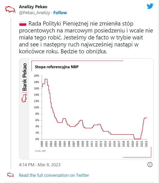 W kontrze do działań Fedu na marcowym posiedzeniu RPP utrzymała stopy procentowe na niezmienionym poziomie (6,75 proc., przy dwucyfrowej inflacji). Jeśli koszt pieniądza w USA sięgnie niebawem 6 proc. (przy dużo niższej inflacji), to jak Polska będzie postrzegana przez inwestorów z obecnym poziomem nominalnych i realnych stóp? Czy inwestorzy zaczną wymagać wyższej premii?