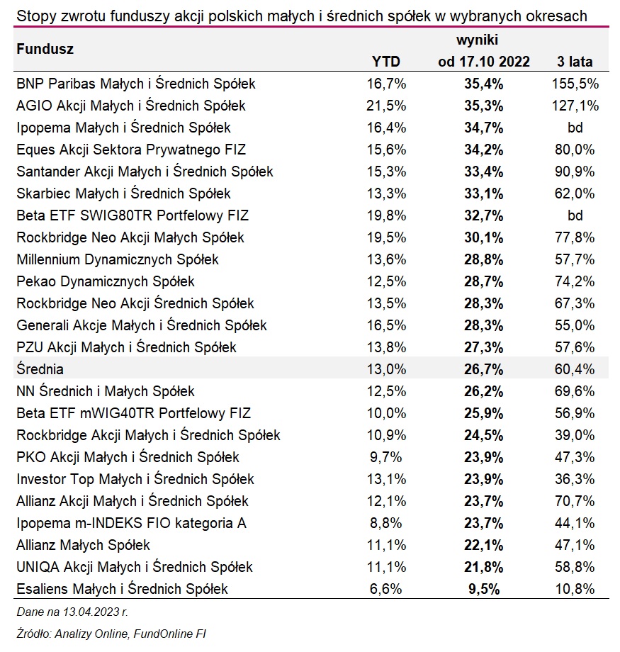 Eksperci podkreślają, że małe spółki z GPW charakteryzują się największym potencjałem wzrostu notowań, ale równocześnie inwestycja w nie obarczona jest większym ryzykiem, a same akcje są zwykle mniej płynne. Ma to szczególne znaczenie w okresie zawirowań rynkowych, dekoniunktury i odpływów kapitału z funduszy. To właśnie z tego powodu coraz więcej funduszowych misiów woli inwestować w firmy o średniej kapitalizacji. Takie podejście od lat stosuje m.in. UNIQA Akcji Małych i Średnich Spółek. Przewagę średnich spółek utrzymuje także Rockbridge Akcji Małych i Średnich Spółek oraz Rockbridge Neo Akcji Średnich Spółek.