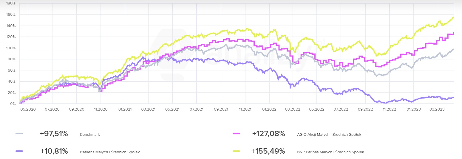 BNP Paribas Małych i Średnich Spółek przez ostatnie 3 lata zarobił aż 155 proc., a od połowy października 2022 r. - ponad 35 proc. i jest to najlepszy wynik w grupie. W portfelu na koniec marca (fundusz publikuje jego skład co kwartał) naliczyliśmy 105 składników i był to tym samym najbardziej zdywersyfikowany fundusz w grupie (obok jest wspomniany wyżej Esaliens, który miał 101 składników).