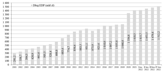 W ubiegłym roku deficyt sektora instytucji rządowych i samorządowych (według GUS) wyniósł 3,7% PKB, czyli około 115 miliardów złotych. Co ciekawe oficjalny deficyt budżetu centralnego wyniósł jedynie 12,4 miliarda złotych, a samorządów 8,1 miliarda złotych. To oznacza, że większość deficytu to deficyt sfinansowany poza budżetem centralnym. Równocześnie udział długu publicznego do PKB (liczony według metodologii unijnej) spadł z 53,6% w 2021 roku do 49,1%. Jak to możliwe? W ubiegłym roku Polska cieszyła się wzrostem gospodarczym, ale rząd jeszcze bardziej był zadowolony z „podatku inflacyjnego”, czyli wzrostu dochodów budżetowych wynikającego z faktu, ze w przypadku wzrostu cen, płacimy kwotowo wyższe podatki (np. VAT). Inflacja sprawiła również, że wzrósł nominalny PKB i w ubiegłym roku przekroczył po raz pierwszy 3 biliony złotych.