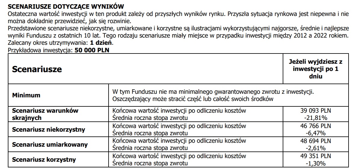 Analizując scenariusze rynkowe, warto pamiętać, że stateczna wartość inwestycji w dany fundusz zależy od przyszłej koniunktury na rynku, która jest zmienna. Poza tym scenariusze biorą pod uwagę maksymalne koszty, jakie mogłyby wiązać się z daną inwestycją, w tym opłaty za nabycie czy umorzenie jednostek, a przecież tych ostatnich można uniknąć, inwestując np. przez internet.