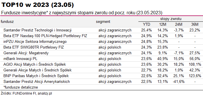 Pierwsze miesiące tego roku to generalnie czas odrabiania strat poniesionych w 2022 roku. Szczególnie dobrze radzą sobie fundusze inwestujące w spółki z amerykańskiego sektora technologicznego. Wystarczy powiedzieć, że w niecałe pięć miesięcy indeks Nasdaq wzrósł aż o 20%. Bardzo dobrze wypadają też fundusze akcji polskich skupione na segmencie małych i średnich spółek. W tym samym czasie indeks giełdowych maluchów zyskał już 23%. I to właśnie przedstawiciele obu tych grup wypełniły zestawienie 10 najzyskowniejszych funduszy, licząc od początku roku.