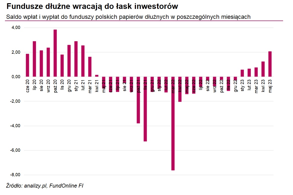 W całym 2022 roku klienci wypłacili z funduszy dłużnych polskich łącznie ponad 18 mld zł. Najwięcej, bo aż 7,6 mld zł wycofano w samym marcu, a więc tuż po zbrojnej napaści Rosji na Ukrainę. Sytuacja wprawdzie nieco uspokoiła się w drugiej połowie roku, ale wciąż więcej kapitału z nich wypłacano, niż wpłacano. Tymczasem od dołka z czerwca ubiegłego roku polskie obligacje skarbowe dały funduszom dłużnym solidnie zarobić. Polacy tę poprawę wyników zauważyli, ale dopiero w tym roku. Od stycznia, czyli przez ostatnie pięć miesięcy do funduszy dłużnych napłynęło w sumie 5,3 mld zł, przy czym większość tej kwoty trafiła do produktów dłużnych uniwersalnych i obligacji skarbowych krótkoterminowych, a więc o relatywnie niskim ryzyku stopy procentowej.