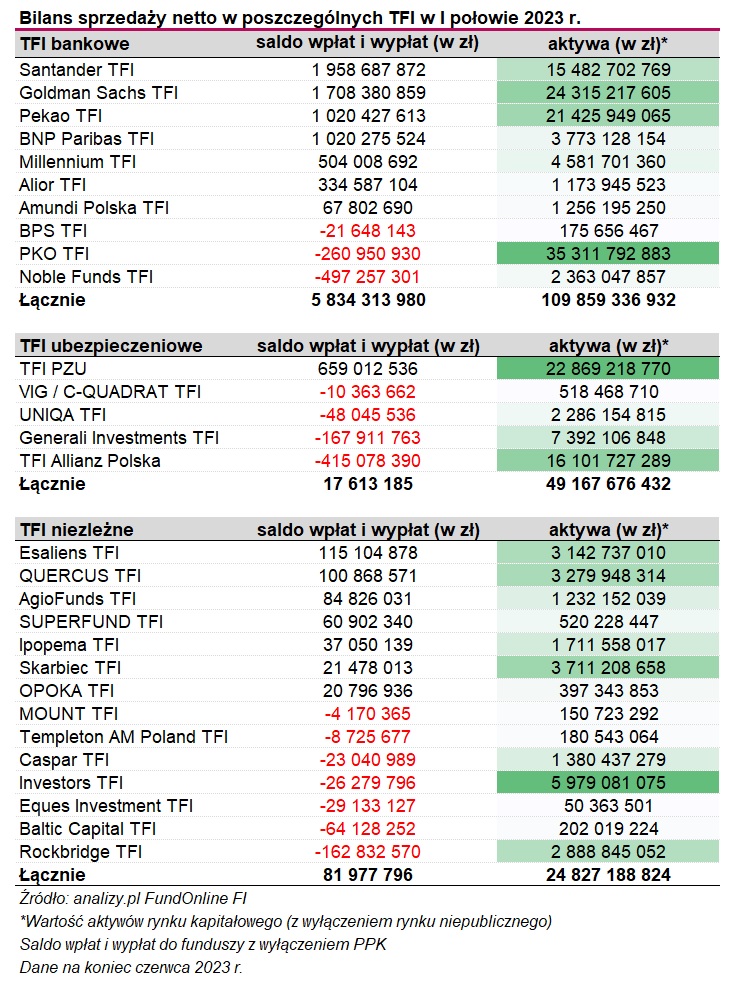 W tej grupie TFI najgorszy bilans sprzedaży netto zanotowało Allianz Polska TFI. W pierwszej połowie roku z funduszy tego towarzystwa wypłacono łączne ponad 400 mln zł. Jest to jednak w głównej mierze efekt odpływu kapitału z jednego funduszu dedykowanego określonej grupie inwestorów (Allianz Akcyjny), z którego wycofano niemal 170 mln zł. Najwięcej pieniędzy pozyskał w tym czasie Allianz Dochodowy (+36 mln zł) oraz Allianz Trezor (+33 mln zł).