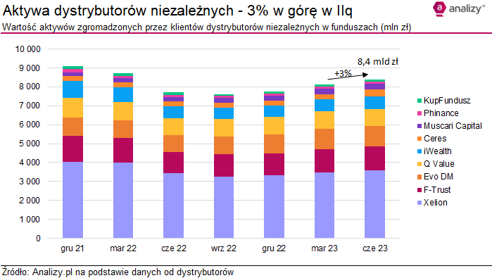 Największym graczem na rynku pozostaje DI Xelion z 3,5 mld zł ulokowanych w funduszach inwestycyjnych, ponad 140 mln zł w innych instrumentach finansowych oraz 1,6 mld zł aktywów ulokowanych przez klientów w usłudze zarządzania aktywami na zlecenie klienta świadczonej przez TFI współpracujące z DI Xelion.
